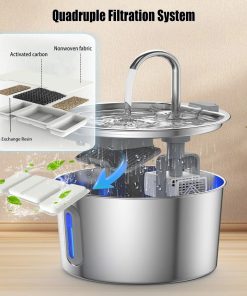 Fris water, de hele dag. Deze stijlvolle drinkfontein van roestvrij staal zorgt ervoor dat jouw kat altijd beschikt over schoon, stromend water. De stille pomp werkt vrijwel geluidloos — geen gestress voor jou, altijd hydratatie voor je kat of hond