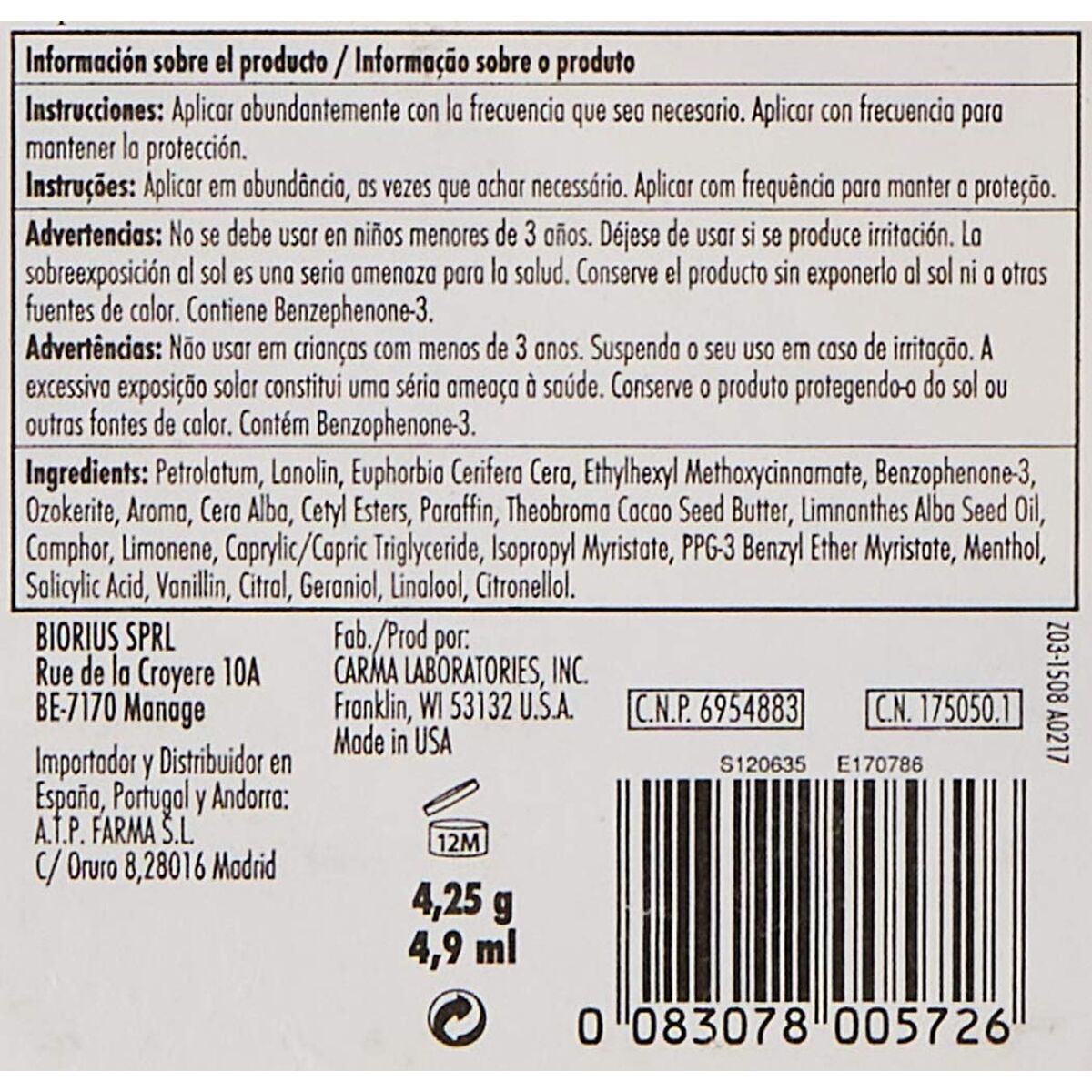 The Carmex COS 012 is a moisturizing lip balm in stick format designed for effective lip care, providing daily nourishment and protection. With a capacity of 4.25 g, this product stands out for its enriched formula that includes a sun protection factor SPF 15, helping to prevent damage caused by UVA and UVB rays, essential for keeping lips protected against environmental aggressions. Made in Spain, this lip balm comes in a lime-scented variant, offering a fresh and revitalizing fragrance that adds a unique sensory experience during application. Its stick format allows for practical and precise application, ideal for carrying in a bag or pocket and using anytime during the day. Additionally, its formula is designed to provide long-lasting hydration, relieving dryness and repairing possible cracks or irritations on the lip skin. The product is suitable for unisex use, adapting to the hydration needs of both men and women, and falls within the para-pharmaceutical cosmetics category, indicating a balance between aesthetic care and dermatological functionality. The Carmex COS 012 combines tradition and effectiveness, with a compact design that enhances daily comfort and usability, making it a reliable choice for those seeking complete lip protection with a touch of citrus freshness. This lip balm offers a practical and safe solution for the daily maintenance of lip health and comfort.